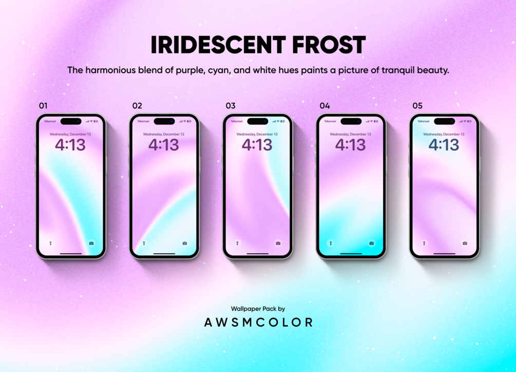 Introducing Iridescent Frost Wallpaper Pack. The harmonious blend of purple, cyan, and white hues paints a picture of tranquil beauty.